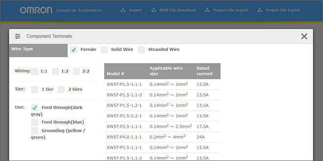 The time and effort of selecting Terminal Blocks, checking the installation space and applicable wires, and marking can be reduced so that you can easily and efficiently select the Terminal Blocks required to wire your devices.